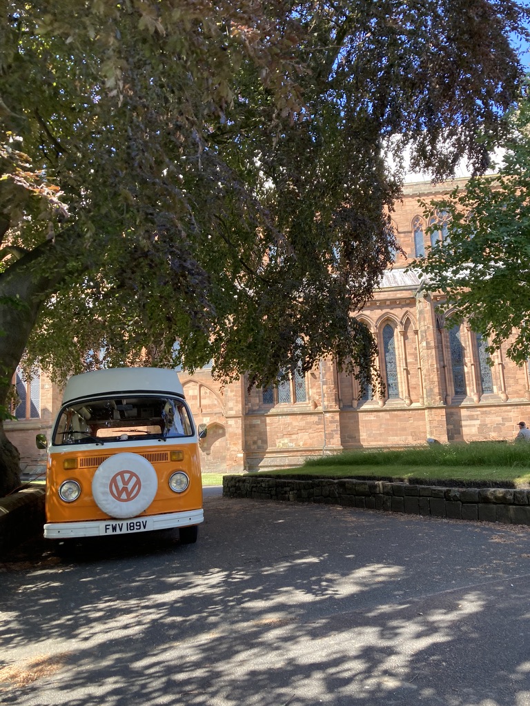 Not that it’s a competition, and all the cathedrals have been welcoming, but Carlisle, by far, up to now, is the most relaxed and the friendliest! As I pulled up Michael (the Canon Missioner who I had been in touch with by email) was just leaving to set off for his holiday. He very happily guided me in and showed me where to plug in. We had a chat about how the drive was, (his face matched Caroline’s when I said I came over the Stang yesterday) and the joys of old VW ownership. Then, when my electric hook up cable was frustratingly a metre short he went off on search of an old one hat he had from the days he had an old Nissan Camper (but he always wanted one of these he said). Then he off he went on his holiday.