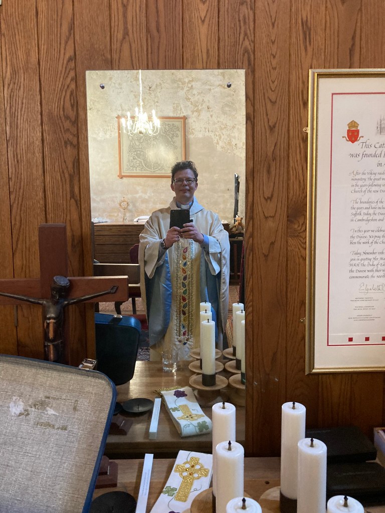 I arrived for morning prayer surprised to see about a dozen people sitting near the high altar all hunched over thier phones. Funny time to be checking Facebook I thought, then I was reminded by a lovely lady that we don’t use books in Ely, we use the Daily Prayer app. I scurried back to the vestry to retrieve my phone and opened the app, resisting the urge to check twitter. After morning prayer I returned to the vestry to put on my robes. I don’t normally wear a causable (the poncho thing that goes over the alb) but when in Rome, or the cathedral. And this was a particularly lovely chasuble. I was touched as I put it on to see the little note sewn inside asking me to remember the lady who made it. The lining matched my shirt, perfect, I think I would have liked Dorothy